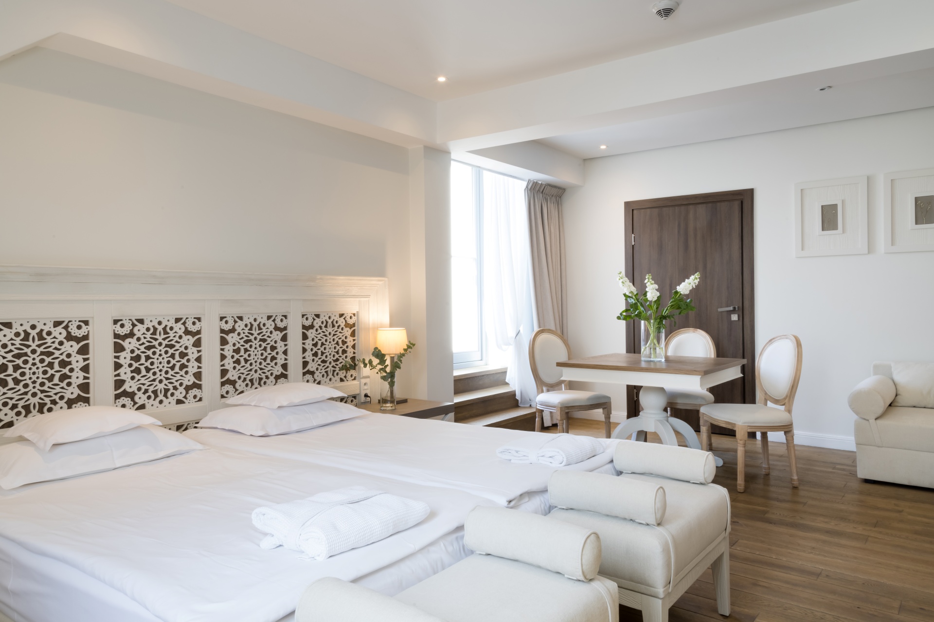 Wnetrza pokoi urzekaja spokojna, stonowana kolorystyka–dominuja tu odcienie bieli, szarosci, kremu, ktore idealnie komponuja sie z naturalnym drewnem, kamieniem oraz motywami roslinnymi i regionalnymi. W niektorych pokojach mozna dostrzec subtelne odniesienia do paluckich haftow, ktore dodaja wnetrzom unikatowego charakteru.