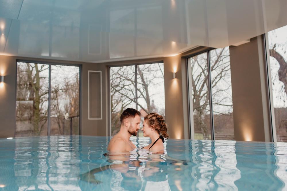 Integralna czescia hotelowego wellness jest przestronna strefa wodna, w ktorej centralne miejsce zajmuje basen z panoramicznym widokiem na Jezioro Chomiaskie. Kapiel w jego cieplej wodzie lub odprezajacy pobyt w jacuzzi pozwalaja zrzucic napiecie dnia codziennego i zatopic sie w blogim relaksie. Po wodnych doznaniach goscie moga wypoczac w przytulnej Strefie Relaksu, sluchajac kojacego szumu wody i podziwiajac nature za oknem.