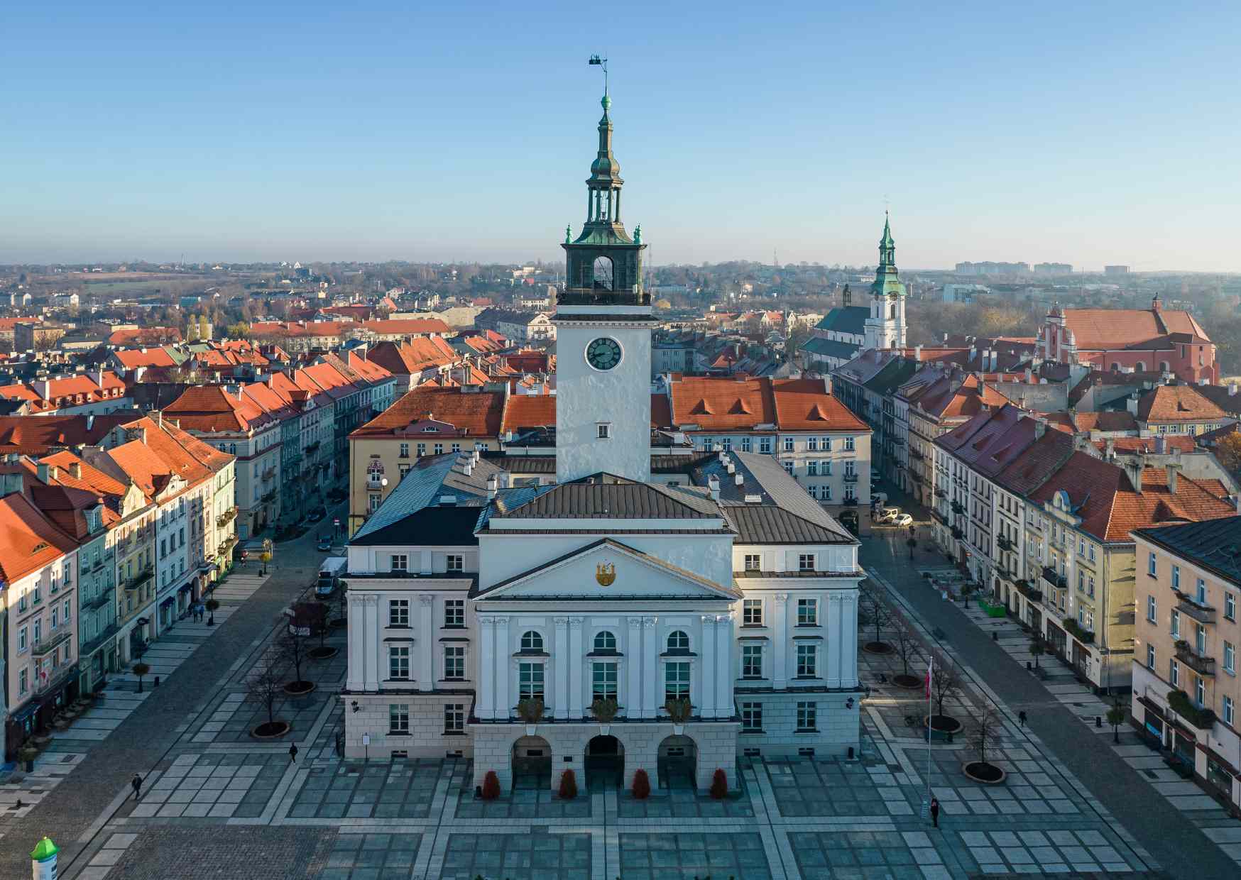 Główny Rynek w Kaliszu to tętniące życiem serce miasta, gdzie historia spotyka się z nowoczesnością. Centralnym punktem jest neoklasycystyczny ratusz, którego wieża stanowi doskonały punkt widokowy, oferując panoramę miasta. Choć pierwotny ratusz spłonął w XIX wieku, obecny budynek wiernie oddaje dawny charakter miejsca.