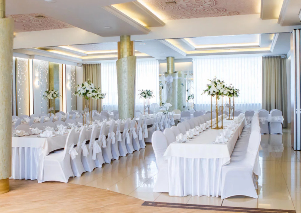 Zarówno klasyczne prostokątne stoły, jak i efektowne okrągłe (do 10 osób) świetnie komponują się z eleganckimi białymi pokrowcami na krzesła oraz dekoracjami ze sztucznych kwiatów - wszystko to wliczone jest w cenę organizacji.