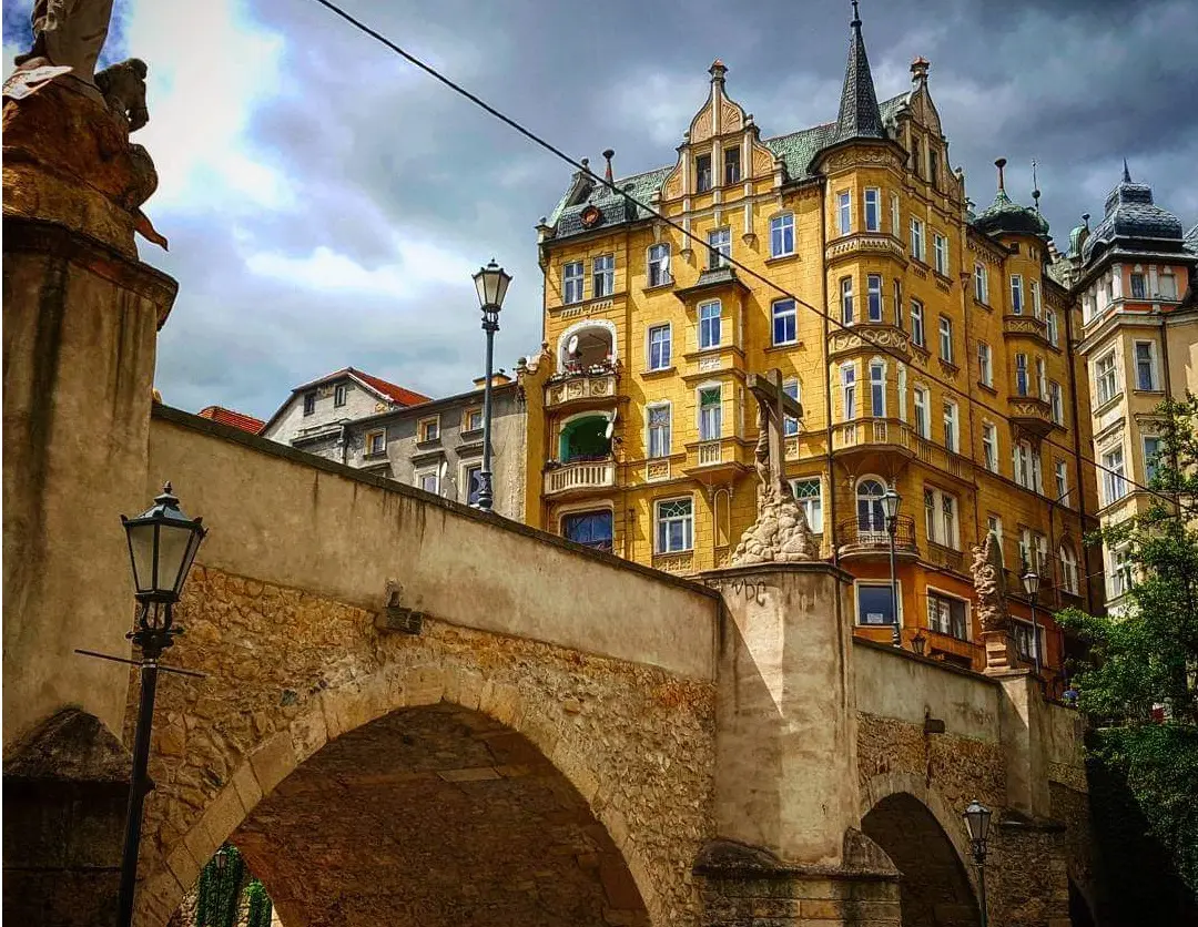 Zabytek wspiera się na 3 filarach, ma 4 przęsla. Niegdyś na końcach mostu znajdowaly się bramy Górna i Dolna. Tę pierwszą wzniesiono już w XIII wieku i najprawodpodobniej stanowila część miejskich murów obronnych. Dolną zbudowano dwa wieki później. Obie zostaly rozebrane w XIX stuleciu. Most byl wielokrotnie przebudowywany i wzmacniany, zwlaszcza w czasie wojen husyckich. A później remontowany.
